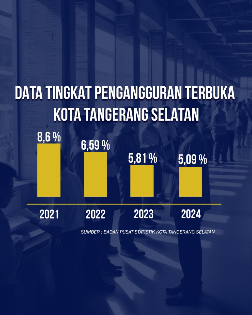 Berdasarkan data terbaru Badan Pusat Statistik (BPS), Tingkat Pengangguran Terbuka (TPT) di Tangsel pada 2024 turun menjadi 5,09 persen, dibandingkan 5,81 persen pada tahun sebelumnya.