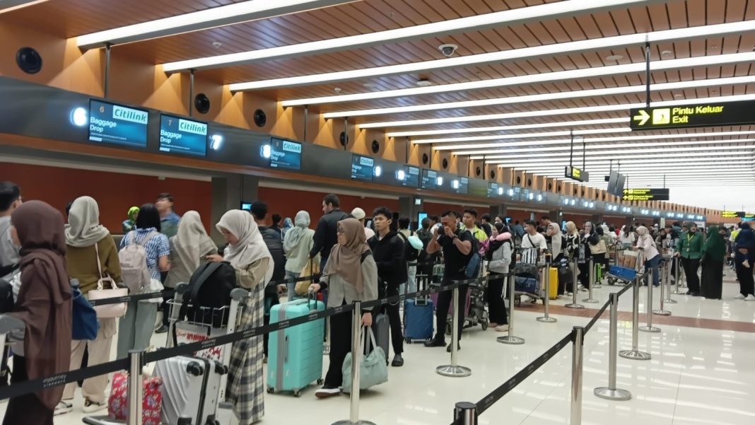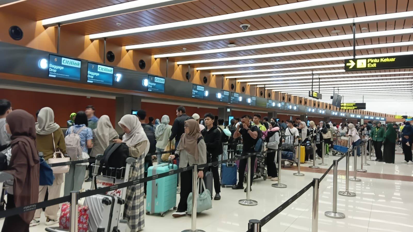 Mudik-Calon penumpang mengantre saat melakukan pelaporan diri (check-in) di Terminal 1C Bandara Internasional Soekarno-Hatta, Tangerang, Banten, Minggu (15/3/2026). Pada musim mudik Lebaran 2026, pemerintah memberikan diskon harga tiket pesawat sebesar 18 persen, meningkat dibandingkan tahun 2025 yang mencapai 14 persen. Kebijakan ini bertujuan membantu masyarakat, khususnya kelas menengah, agar lebih mudah menggunakan transportasi udara untuk pulang ke kampung halaman.(Fiz).