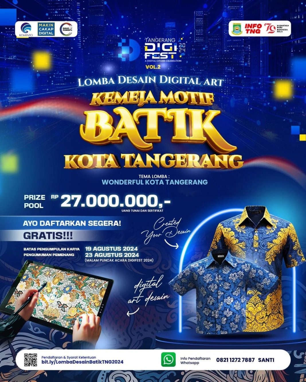 HARIANRAKYAT.ID- Dinas Komunikasi dan Informatika (Diskominfo) Kota Tangerang siap kembali menggelar Tangerang Digital Festival Vol. 2 pada Agustus mendatang. Kemeriahannya pun sudah dimulai, salah satunya dengan dibukanya Lomba Desain Digital Art Kemeja Motif Batik Kota Tangerang, dengan total hadiah Rp27 juta.