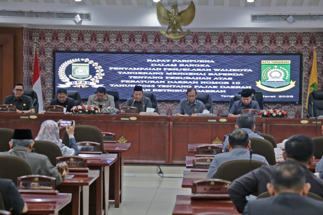 HARIANRAKYAT.ID—DPRD Kota Tangerang menggelar rapat paripurna dalam rangka penyampaian dan penjelasan Wali Kota Tangerang mengenai Rancangan Peraturan Daerah (Raperda) tentang Perubahan atas Peraturan Daerah Nomor 10 / 2023 tentang Pajak Daerah dan Retribusi Daerah di Ruang Paripurna, Rabu (12/3/2025).