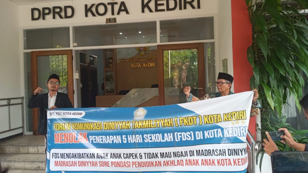 HARIANRAKYAT.ID-KOTA KEDIRI, Forum Komunikasi Diniyyah Takmiliyah (FKDT) Kota Kediri mendatangi kantor DPRD Kota Kediri untuk melakukan Rapat Dengar Pendapat (RDP) pada Senin (23/10/2023). Kedatangan mereka meminta agar kebijakan masuk sekolah lima hari dikembalikan menjadi enam hari.