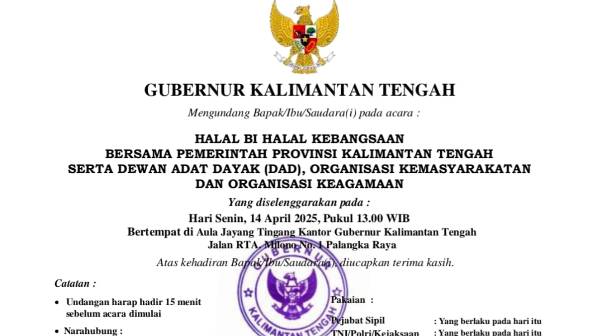 HARIANRAKYAT.ID PALANGKA RAYA – Pemerintah Provinsi (Pemprov) Kalimantan Tengah mengadakan acara Halal Bi Halal Kebangsaan yang akan berlangsung di Aula Jaya Tingang (AJT), Kantor Gubernur setempat, pada Senin besok (14/4/2025). Acara tersebut turut mengundang Ikatan Media Online (IMO) Kalteng.