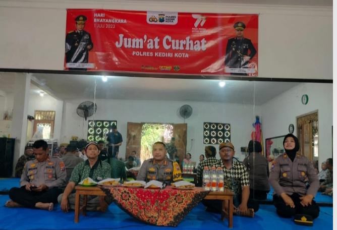 HARIANRAKYAT.ID-KOTA KEDIRI -Polres Kediri Kota mengadakan Jumat Curhat berlangsung di Kampung Budaya Kelurahan Mojoroto Kota Kediri, Jumat (23/6/2023).