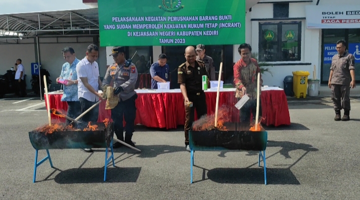 HARIANRAKYAT.ID-KABUPATEN KEDIRI, Kejaksaan Negeri (Kejari) Kabupaten Kediri Provinsi Jawa Timur musnahkan barang bukti perkara tindak pidana sejak Januari hingga September 20233. Berlangsung di halaman Kantor Kejaksaan Negeri Kabupaten Kediri, Kamis (28/12/2023).