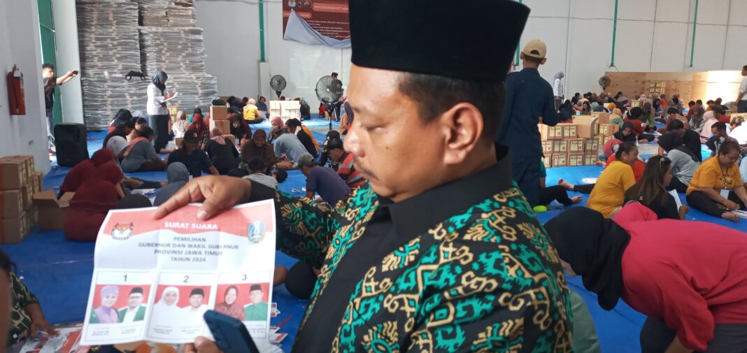 HARIANRAKYAT.ID, KABUPATEN KEDIRI–Komisi Pemilihan Umum (KPU) Kabupaten Kediri mulai melakukan penyortiran dan pelipatan surat suara untuk Pemilihan Gubernur (Pilgub) dan Pemilihan Bupati (Pilbup) dalam rangka Pilkada 2024. Berlangsung di gudang logistik di Desa Gampengrejo, Kabupaten Kediri, Selasa, 29 Oktober 2024.