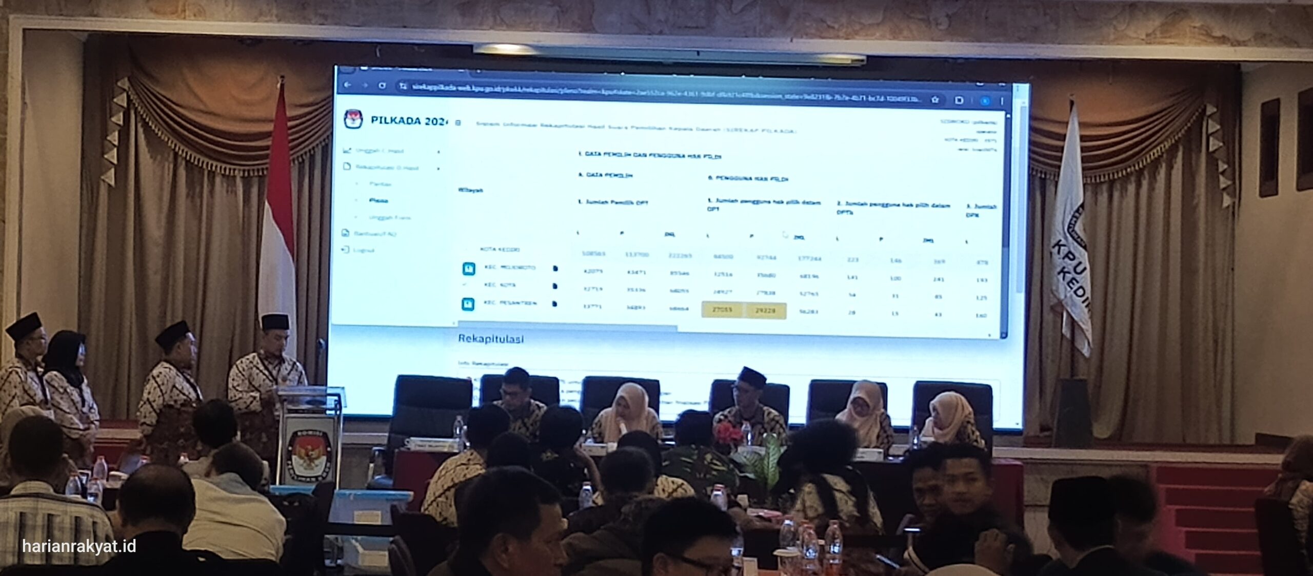 HARIANRAKYAT.ID, KOTA KEDIRI–Komisi Pemilihan Umum (KPU) Kota Kediri menggelar rapat pleno terbuka untuk rekapitulasi hasil penghitungan suara Pemilihan Walikota dan Wakil Walikota Kediri tahun 2024. Acara ini berlangsung di Grand Lotus Hotel, Jalan Jaksa Agung Suprapto, Kota Kediri, pada Selasa (3/12/2024).