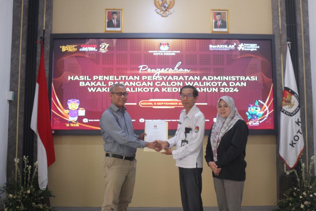 HARIANRAKYAT.ID, KOTA KEDIRI- Komisi Pemilihan Umum (KPU) Kota Kediri menyerahkan Berita Acara Penelitian Persyaratan Administrasi Pasangan Calon (Paslon) Walikota dan Wakil Walikota Kediri. Berlangsung Kamis (5/9/2024)