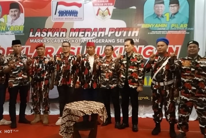 HARIANRAKYAT.ID, KOTA TANGSEL- Markas Cabang (Mascab) Laskar Merah Putih (LMP) Kota Tangsel menggelar deklarasi dukungan kemenangan pasangan calon Gubernur Banten nomor urut 1, Airin-Ade dan Calon Walikota dan Wakil Walikota Tangsel Benyamin-Pilar pada Pilkada 2024. Berlangsung di Kampoeng Anggrek, Tangerang Selatan, Minggu (10/11/2024).