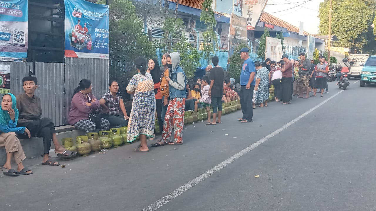HARIANRAKYAT.ID-KOTA KEDIRI, Sejumlah warga mengantre gas elpiji 3 kg di Jalan MH Thamrin, Kelurahan Kemasan, Kecamatan Kota, Kota Kediri Jawa Timur, Kamis sore (27/7/2023).