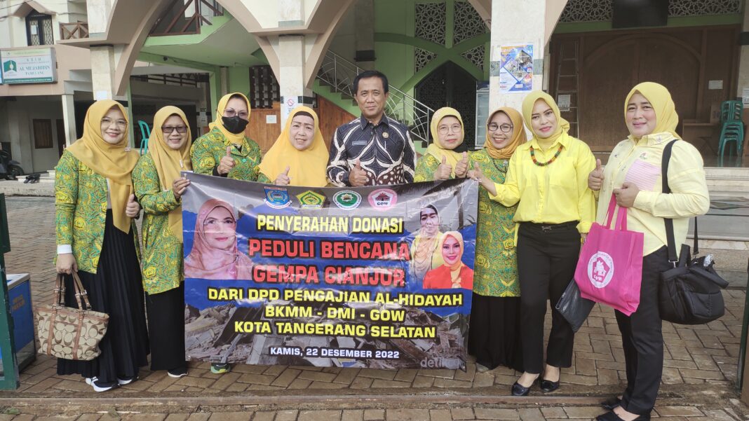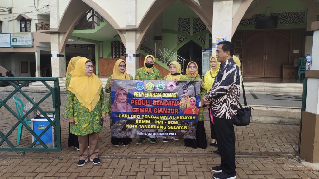 Ketua Majelis Taklim Al-Hidayah Kota Tangsel HJ Fathiyah menyampaikan peduli gempa Cianjur dengan mengirimkan donasi dari MT Al Hidayah, BKMM-DMI serta GOW, diterima langsung Ibu Wakil Bupati Cianjur Yuli Rosadeani di kediamannya. Turut didampingi ketua DPD pengajian Al Hidayah Provinsi Jawa Barat dan jajarannya. Seusai disambut dengan haru, akhirnya rombongan diantar ke titik lokasi bencana, Kampung Cariu Kecamatan Cugenang – Kabupaten Cianjur. Memakan waktu kurang lebih setengah jam.