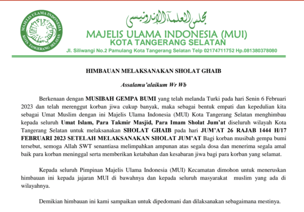 KOTA TANGSEL-MUI Kota Tangsel mengeluarkan imbauan pelaksanaan shalat ghaib atas musibah gempa bumi Turki beberapa waktu lalu. Pelaksana sholat ghaib dilaksanakan setelah Sholat Jumat 26 Rajab 1444 H/ 17 Februari 2023.