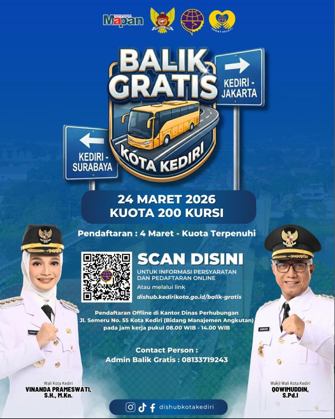 HARIANRAKYAT.ID, KOTA KEDIRI – Pemerintah Kota Kediri melalui Dinas Perhubungan Kota Kediri (Dishub) kembali menghadirkan program Balik Gratis bagi masyarakat yang akan kembali ke perantauan usai Hari Raya Idulfitri. Tahun ini, sebanyak 200 kursi disiapkan untuk keberangkatan pada 24 Maret 2026.