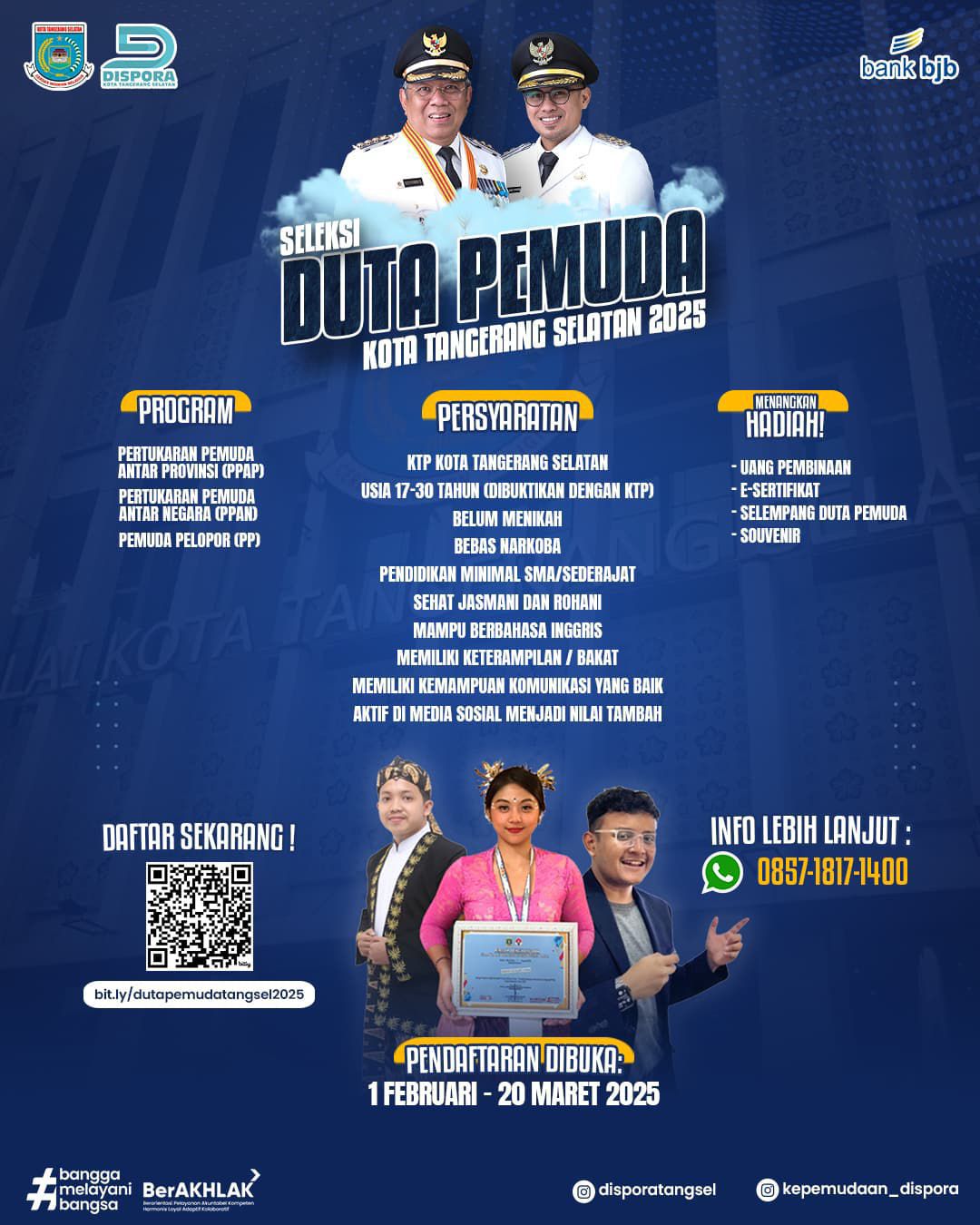 KEMENPORA. Link Pendaftaran,  PPAN (s.id/ppantangsel2025) dan PPAP (s.id/pemudapeloportangsel2025) atau melalui Contact Person : 0857-1817-1400 (WhatsApp). (adv).