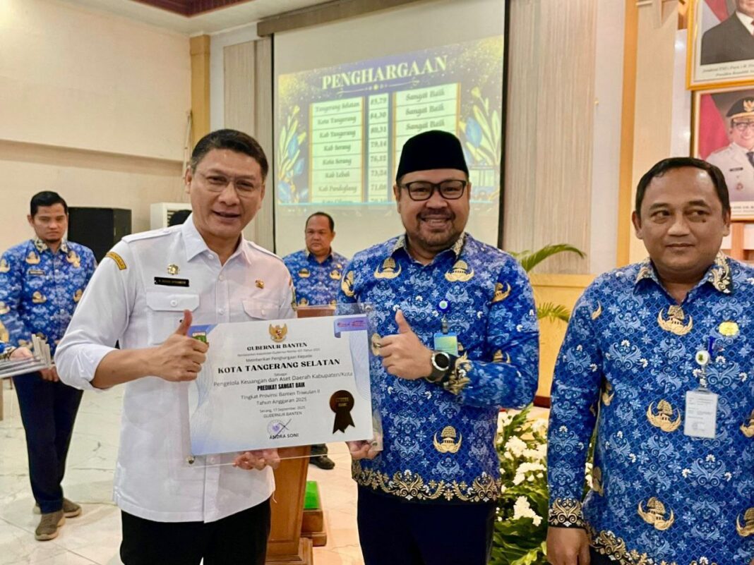 Penghargaan diserahkan Sekretaris Daerah (Sekda) Banten, Deden Apriandhi dan diterima oleh Sekretaris Badan Keuangan dan Aset Daerah (BKAD) Kota Tangsel, Billy, pada Rabu (17/09/2025).