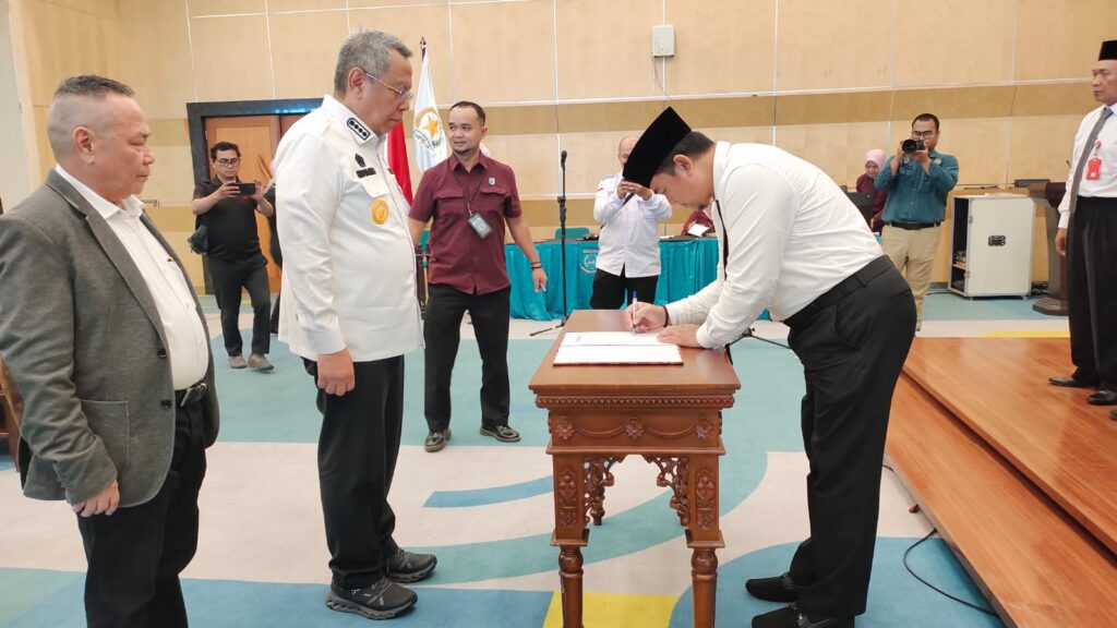 Usai dilantik, Ketua FKUB Tangsel Ahmad Sofyan Mastas menandatangani berita acara pelantikan bersama Walikota Tangsel Benyamin Davnie yang disaksikan Dewan Penasehat FKUB Dr Fachruddin Zuhri, serta perwakilan Pimpinan Lembaga Keagamaan Kota Tangsel KH Hasan Mustofi. (din).