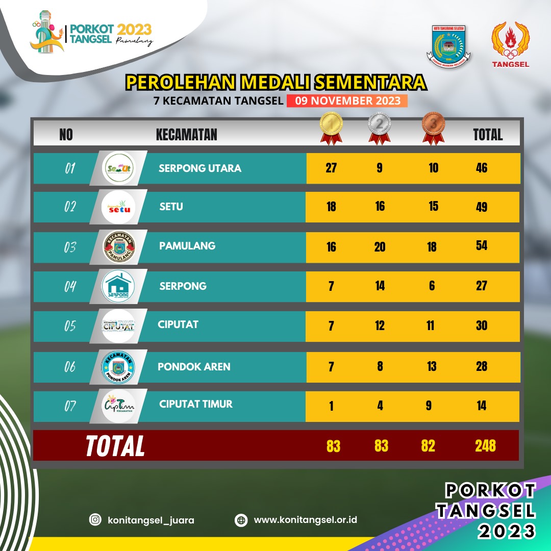Pekan Olahraga Kota (Porkot) Tangsel 2023 digelar sejak 4-11 November 2023 di Kecamatan Pamulang. Berikut perolehan sementara medali per Kamis (9/11/2023).