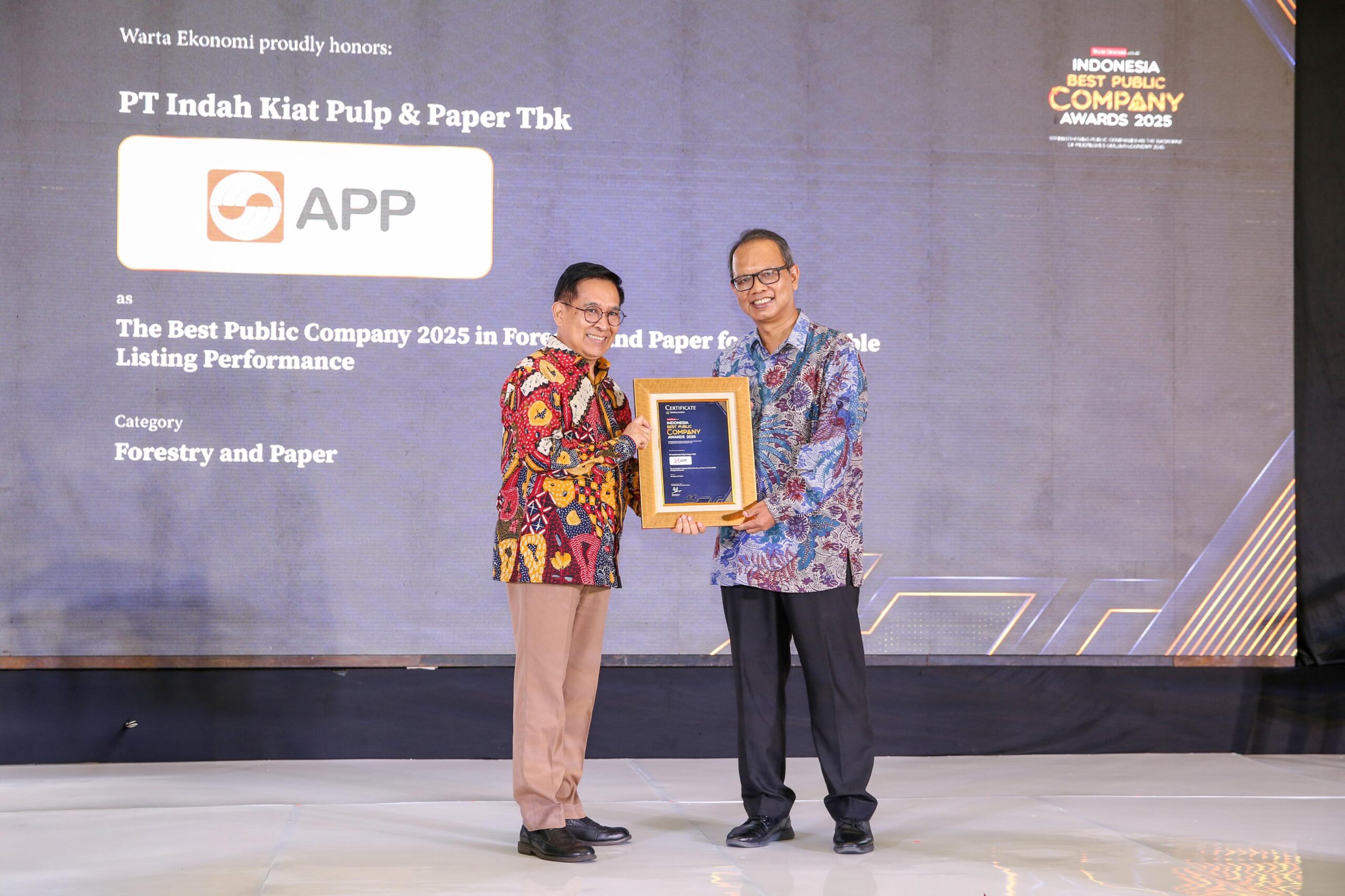 HARIANRAKYAT.ID, Jakarta, 31 Oktober 2025 – PT Indah Kiat Pulp & Paper Tbk, unit usaha APP Group, kembali mencatatkan prestasi dengan meraih penghargaan The Best Public Company 2025 in Forestry and Paper for Formidable Listing Performance dalam ajang Indonesia Best Public Company Awards 2025 yang diselenggarakan oleh Warta Ekonomi di The Sultan Hotel & Residence, Jakarta.