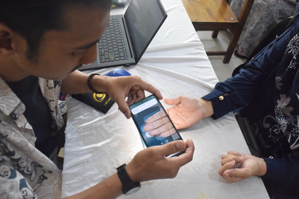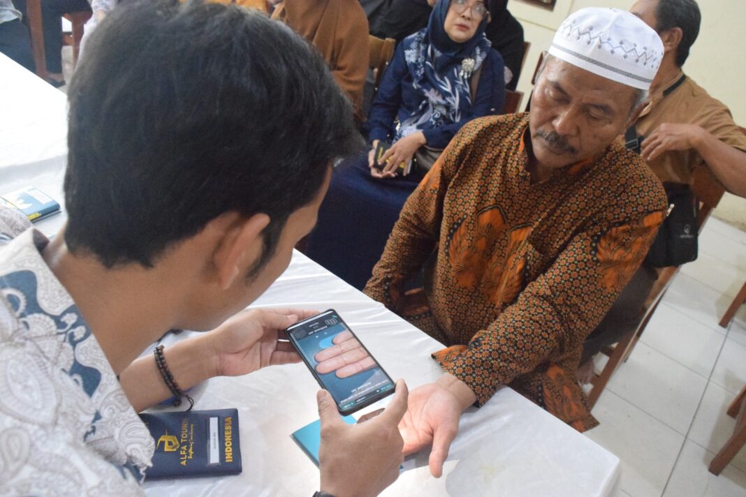 VISA BIO:Petugas dari Kementrian Agama Tangerang Selatan saat memindai sidik jari seorang calon haji saat proses pengambilan data biometrik (wajah dan sidik jari) melalui aplikasi Saudi Visa Bio di KBIH Daarul Hikmah, Pamulang, Tangerang Selatan, Banten, Sabtu (27/9/2025).