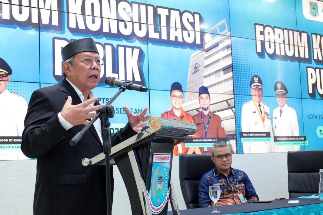 Wali Kota Tangerang Selatan (Tangsel) Benyamin Davnie usai kegiatan Forum Konsultasi Publik Pelayanan Perizinan Kota Tangsel di Ruang Command Center, Puspemkot Tangsel, Kamis, (03/7/2025).