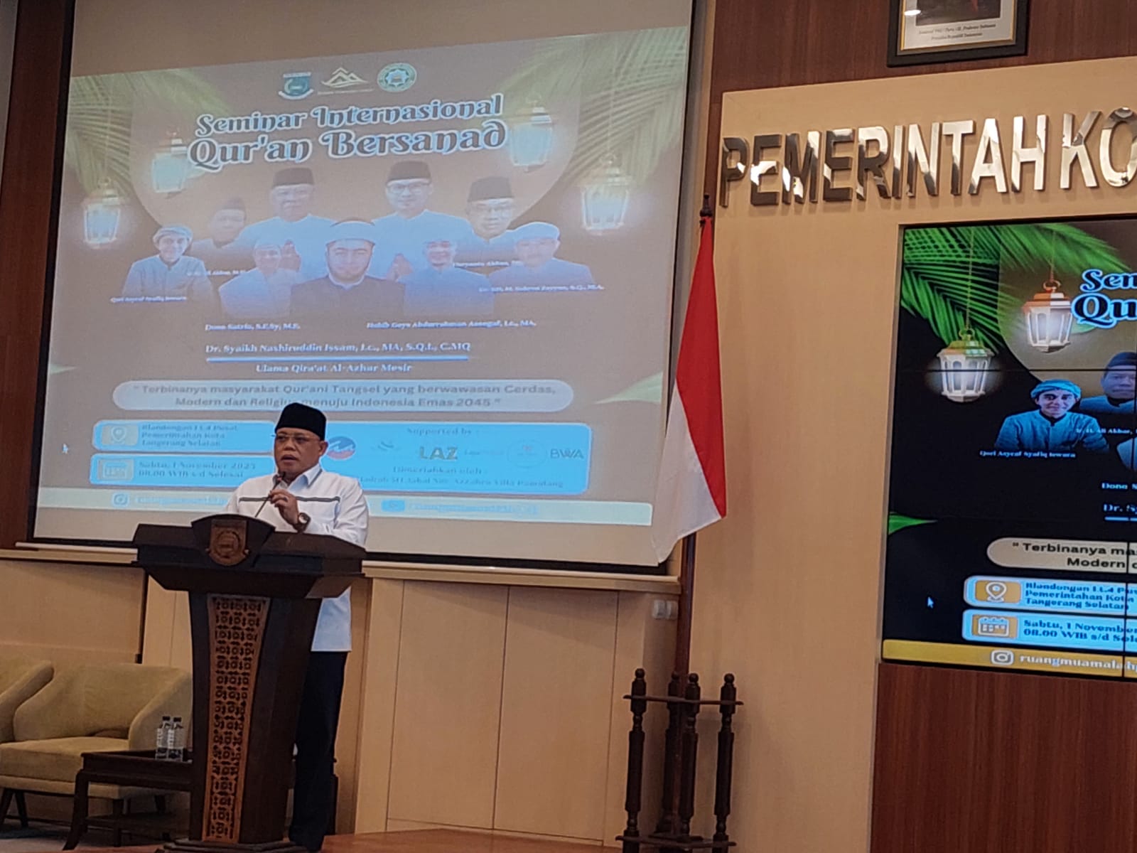 Demikian mengemuka kala dirinya memberikan sambutan pada Seminar Internasional Al-Quran Bersanad yang digelar oleh Yayasan Ruang Muamalat Global di Puspemkot Tangsel pada hari ini Sabtu pagi 1 November 2025.