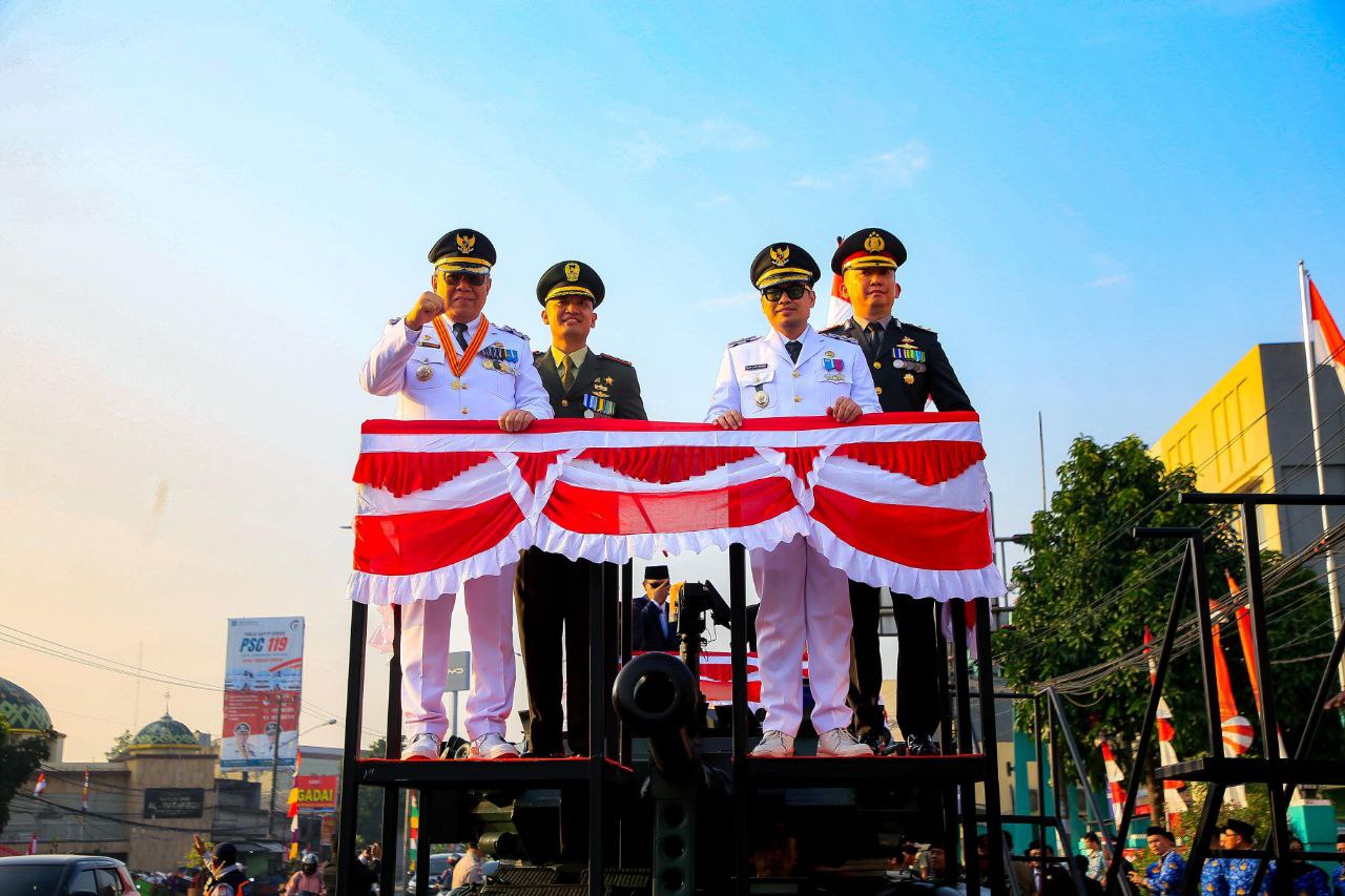 Wali Kota Tangerang Selatan Benyamin Davnie bersama Wakil Wali Kota Pilar Saga Ichsan memimpin iring-iringan kendaraan tempur dari dari Kantor Kelurahan Pondok Jagung menuju Lapangan Batalyon Kavaleri 9, Kecamatan Serpong, lokasi upacara pengibaran bendera merah putih.