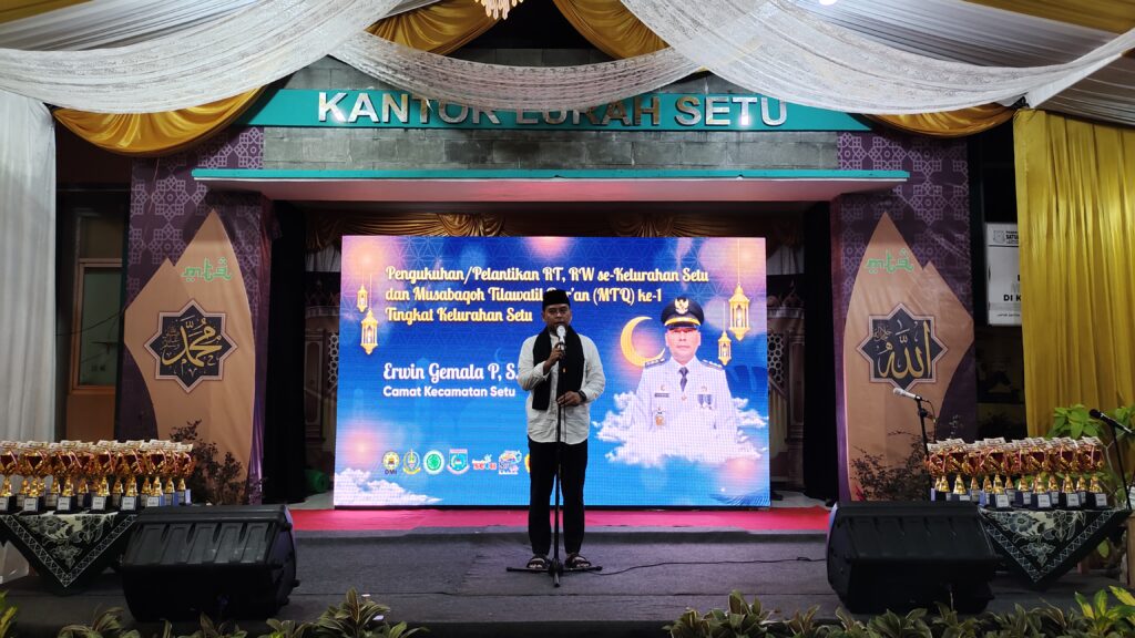 Camat Setu Erwin Gemala Putra menyampaikan dalam rangka pelaksanaan Musabaqah Tilawatil Qur’an yang pertama yang sebelumnya telah dilaksanakan Kelurahan Muncul dan Kelurahan Keranggan. Malam ini (tadi) pembukaan di Kelurahan Setu dan Minggu pagi pelaksanaan lomba.